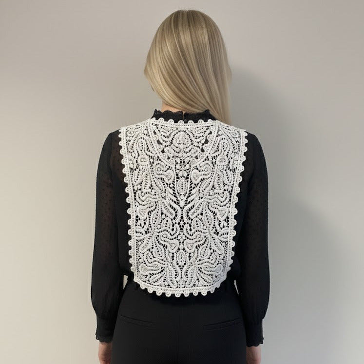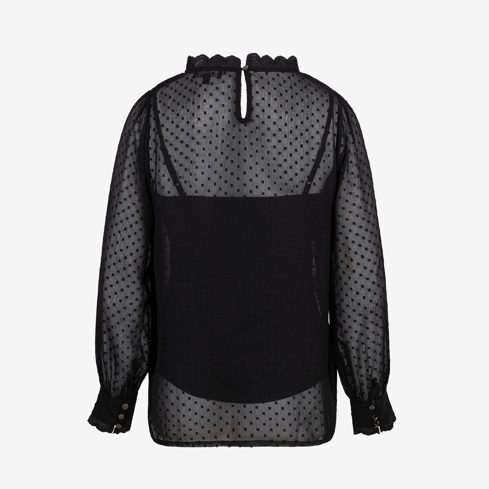 Manches longues légèrement froncées, ajoutant du volume et de la fluidité, terminées par des poignets élégants : 3 boutons gravés coloris argent et un galon en broderie anglaise.